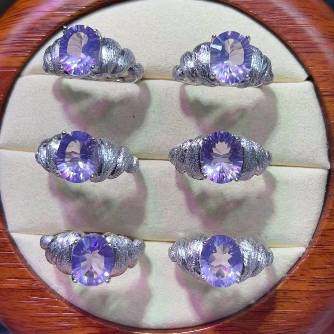 This ring with a large oval-shaped purple stone set in a textured band. The design appears elegant and modern, with a unique twisted pattern on the metal that enhances its overall appeal. The purple stone adds a striking touch to the piece, making it stand out as a distinctive accessory.-ring size adjustable by yourself