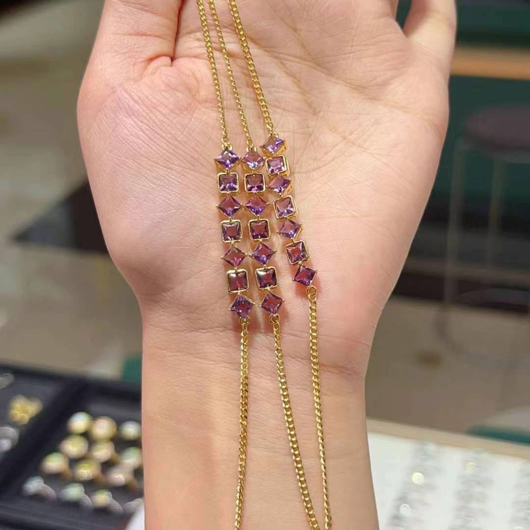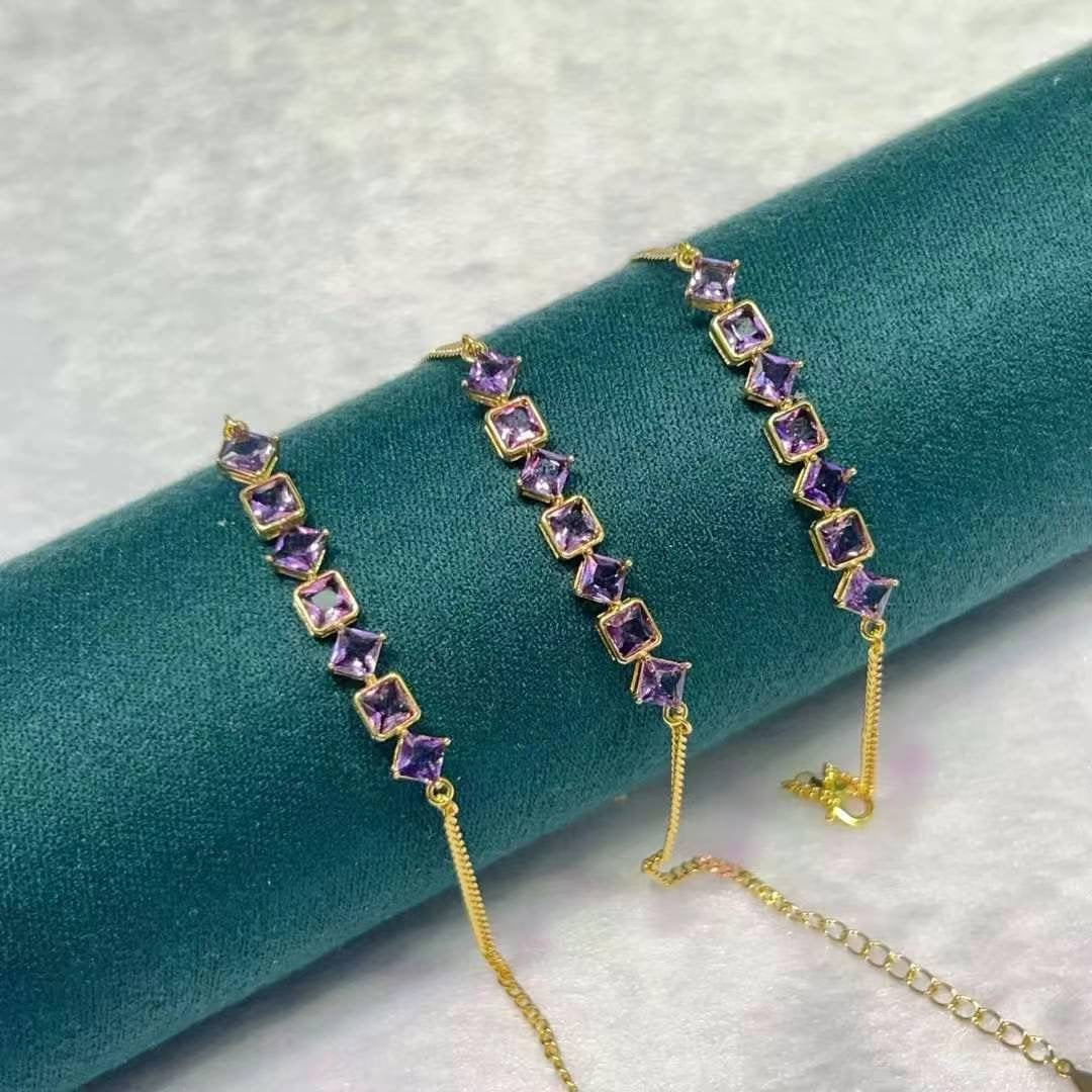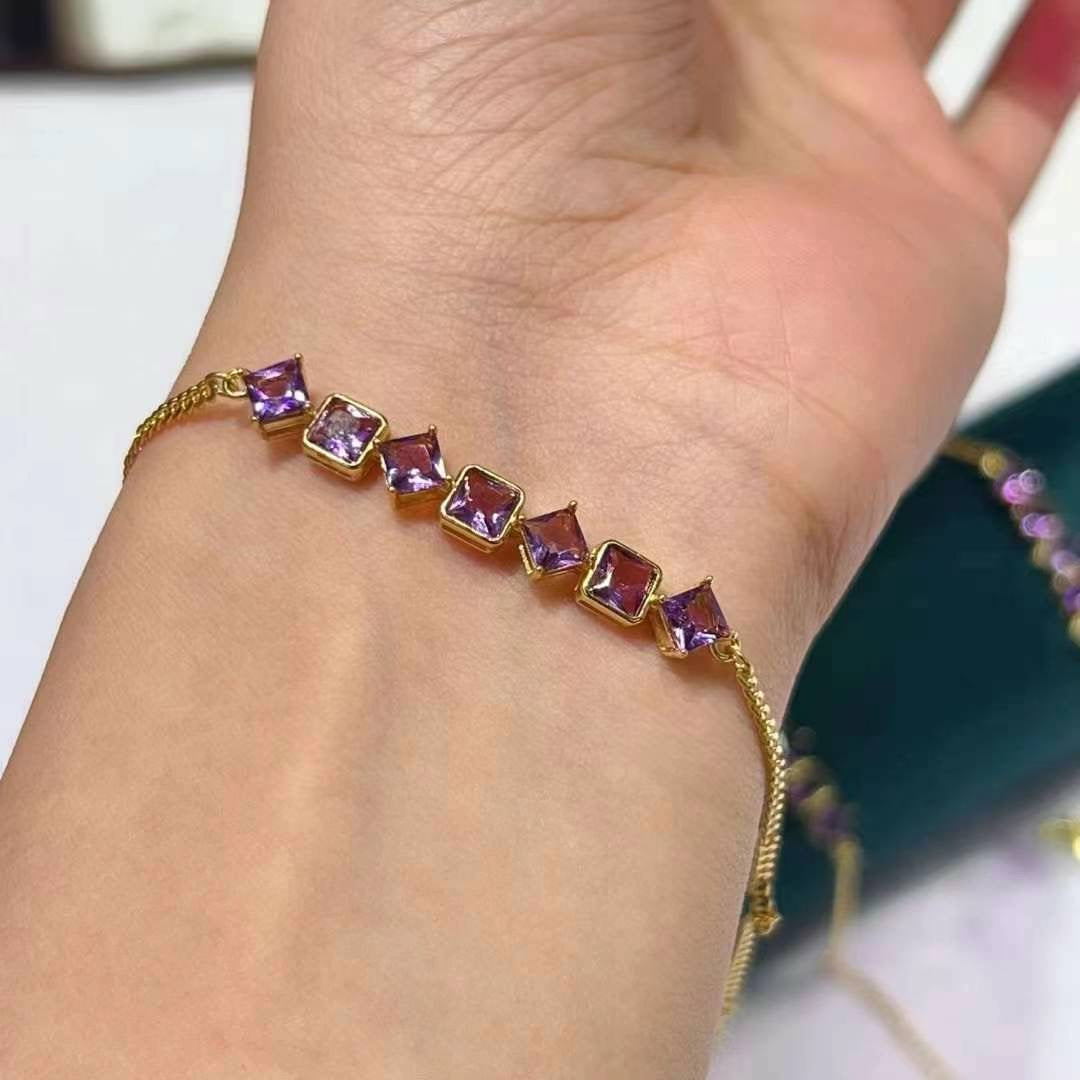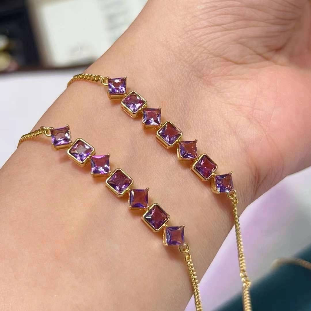This is a stylish bracelet featuring a series of square-cut amethysts, set in S925 silver with gold look. The design is elegant and modern, emphasizing the vibrant colors of the stones. If you have any specific questions or if there's something you'd like to know more about regarding this bracelet, feel free to
