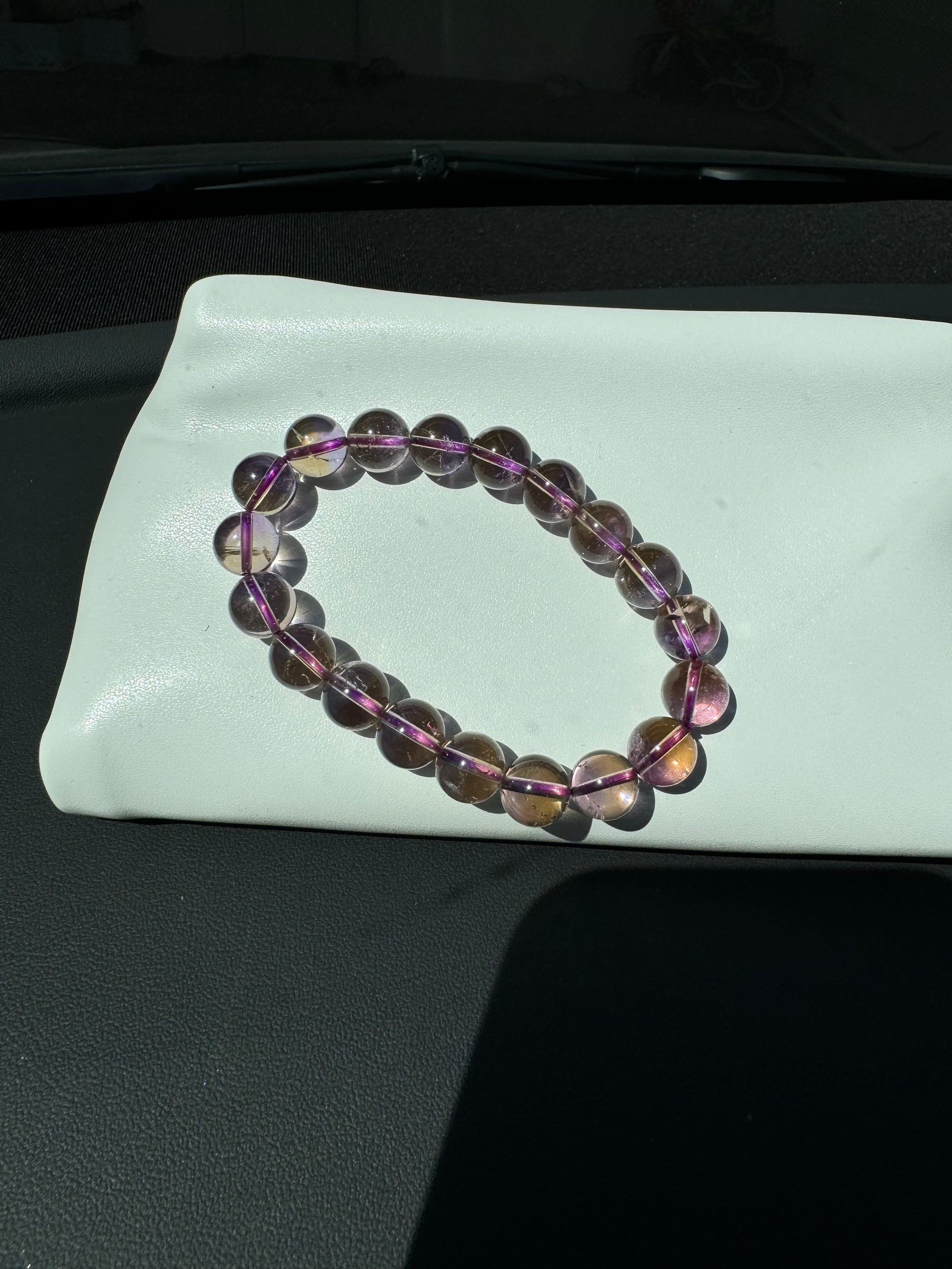 10+mm Ametrine, good fit for waist circumference 16.5 and less. a great balance between purple and yellow color.