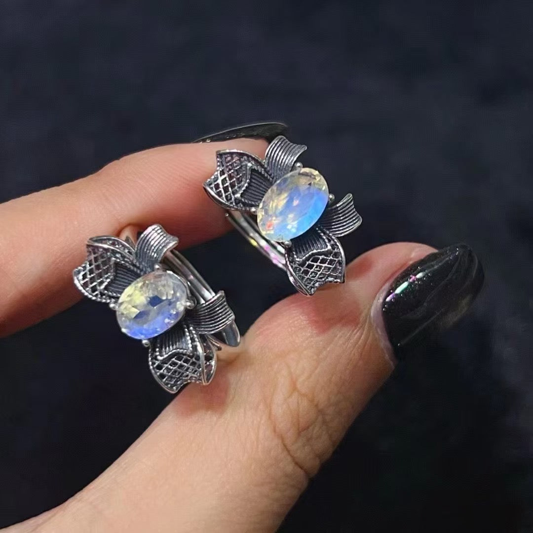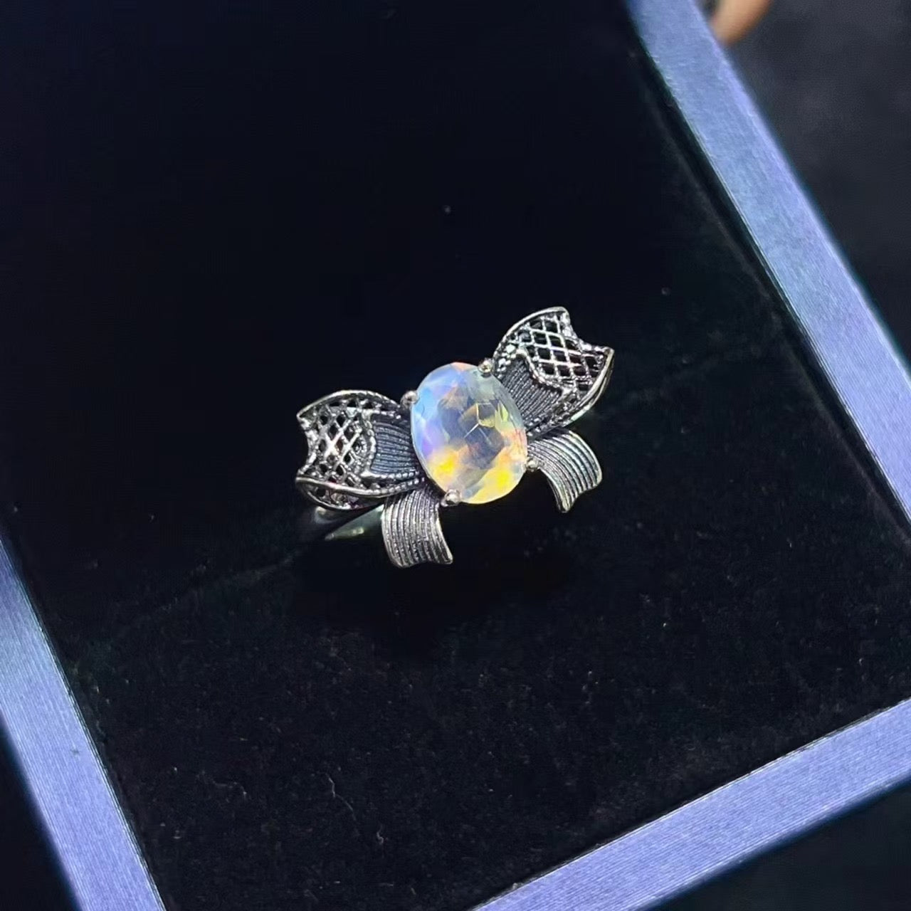 This ring is soooo cute with an oval-shaped moonstone! The ring's band displays an intricate pattern resembling a bow or ribbon, adding an elegant and detailed touch to the overall design. The contrast between the dark metal and the glowing stone creates a striking visual effect.