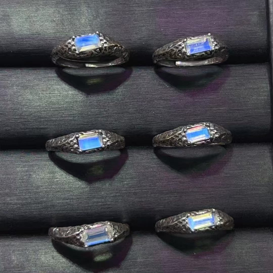 This cool ring features a Moonlight stone with a shimmering, bluish glow. The band of the ring has an intricate, textured design that adds to its unique appearance. The overall effect is elegant and eye-catching.