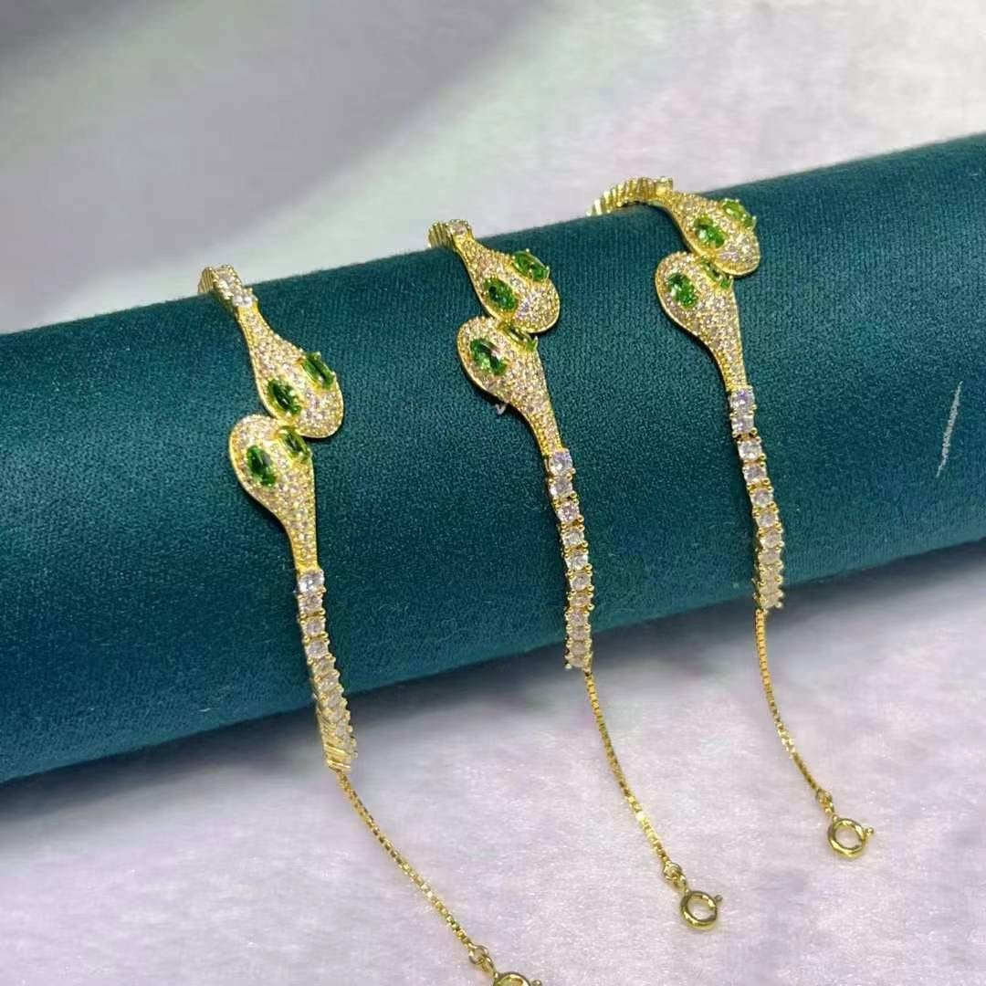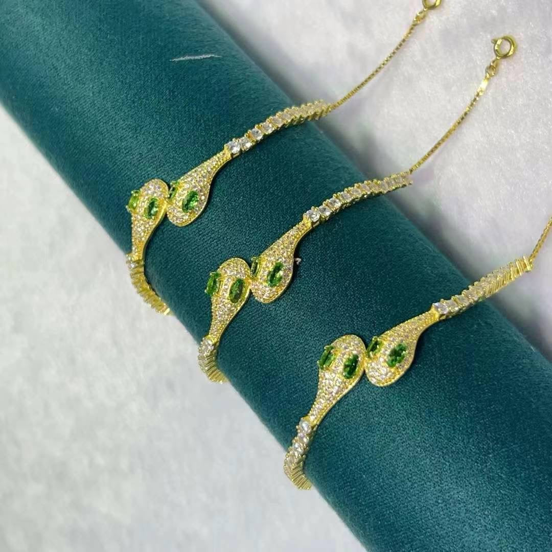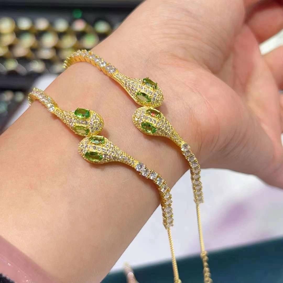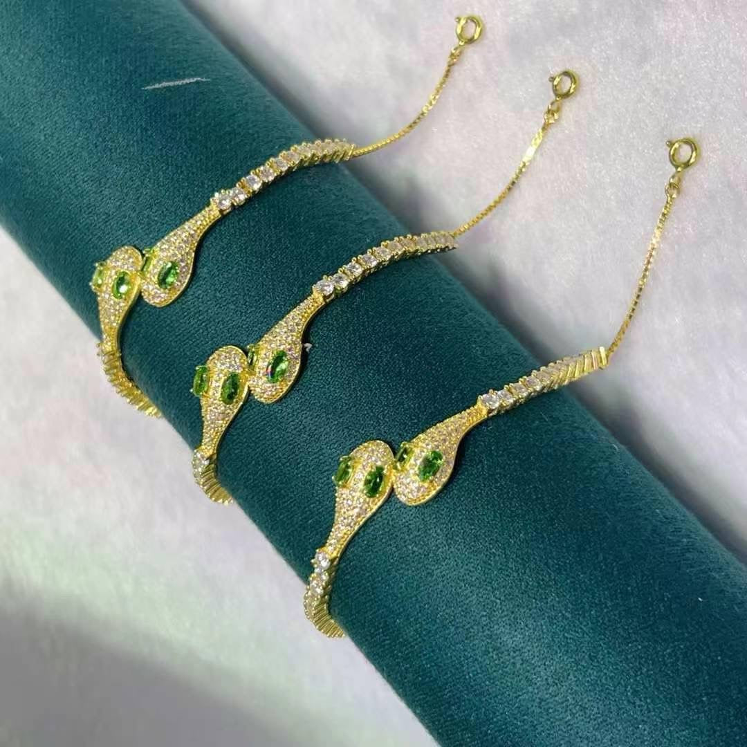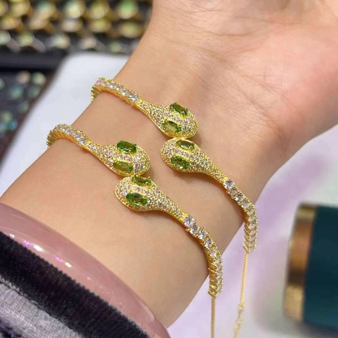 This a striking bracelet featuring a snake motif, adorned with peridots or similar stones, alongside sparkling clear stones, with silver setting. The gold accents add warmth and richness to the design. The snake design may symbolize various meanings, bringing a unique element to the piece.