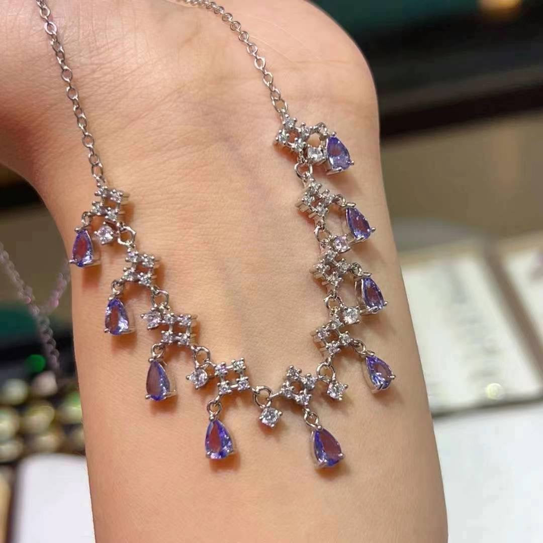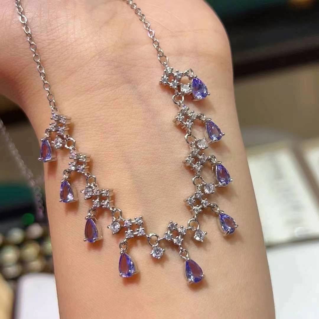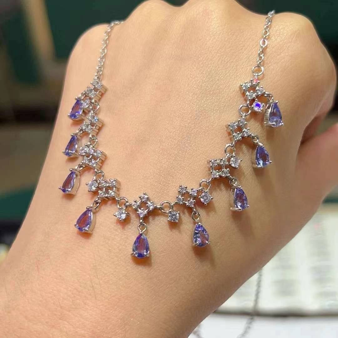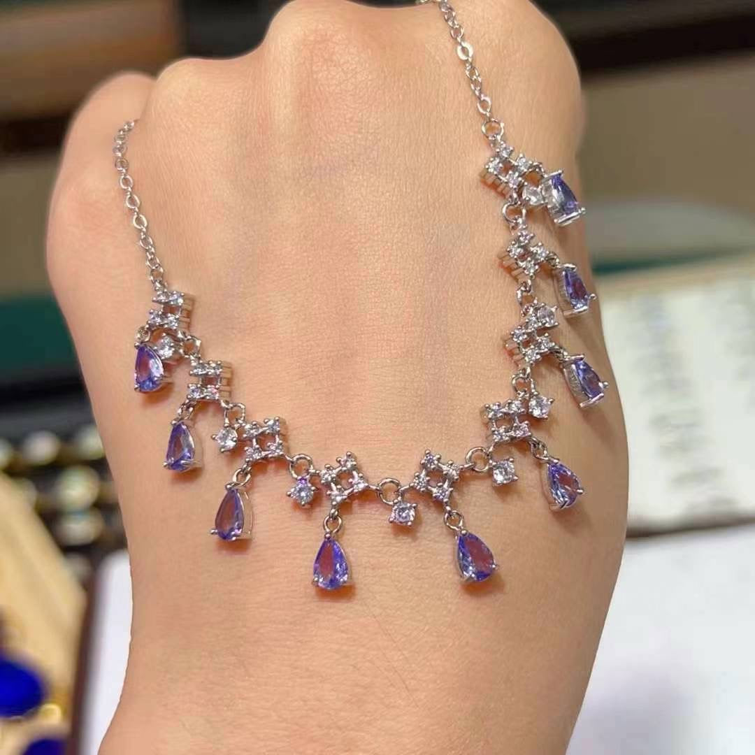 This features an exquisite design with oval and teardrop-shaped purple tanzanite. The stones are interspersed with clear sparkling stones, creating an elegant and eye-catching look. The arrangement forms a graceful pattern, and the silver setting enhances the overall sophistication of the piece.